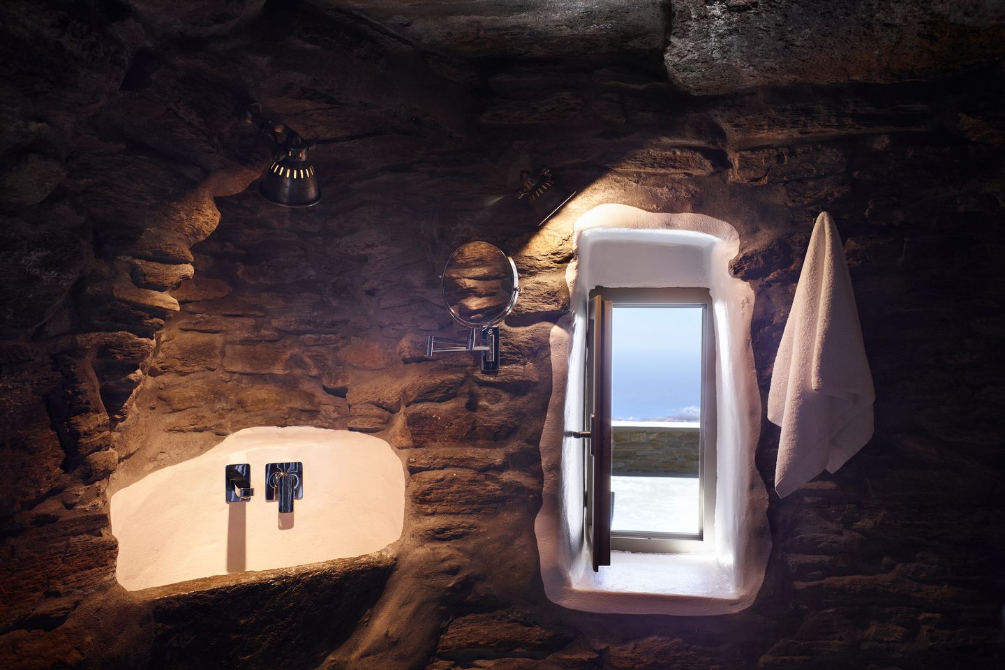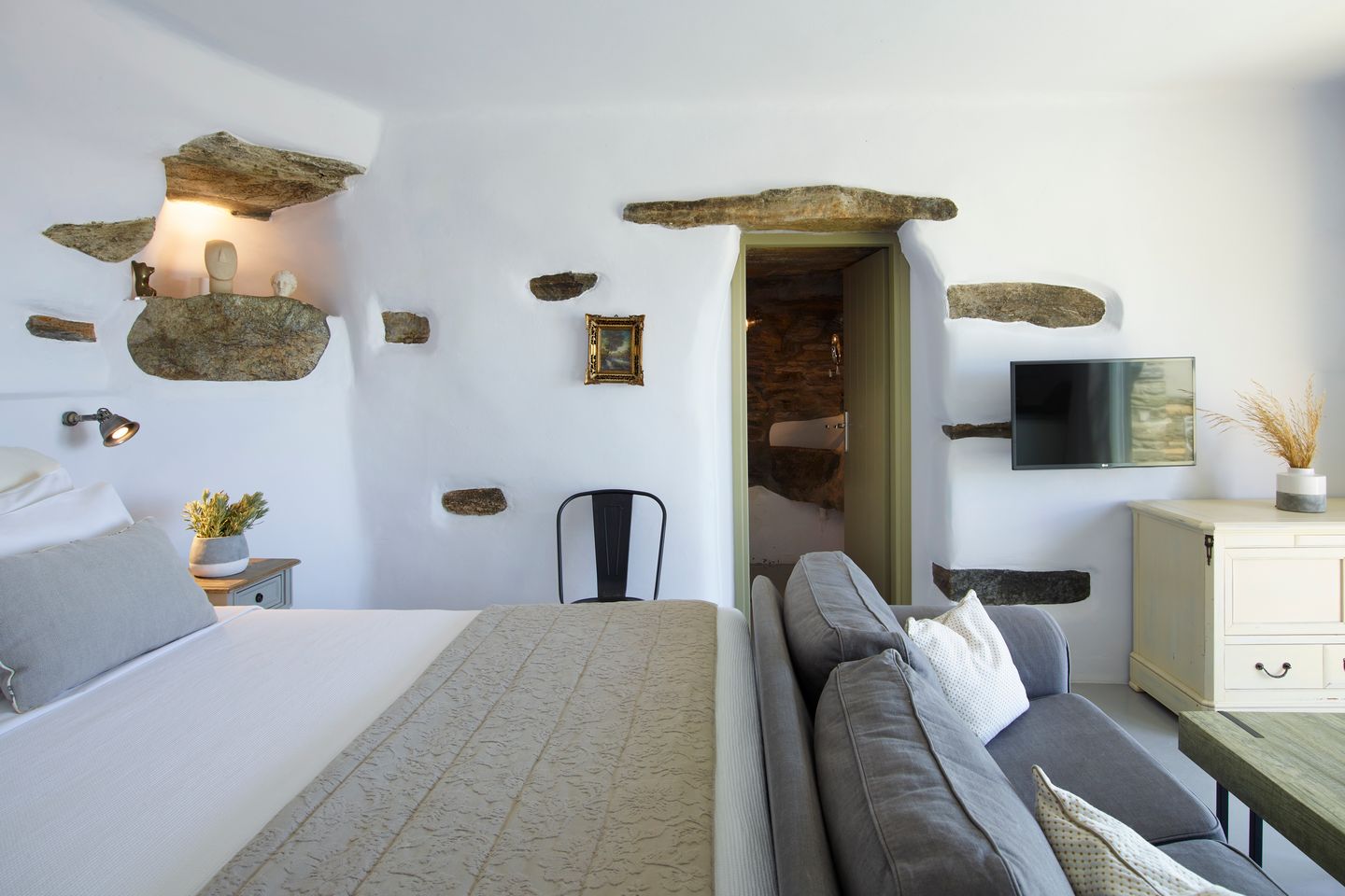 Η Cave Suite είναι διαμορφωμένη μέσα στον βράχο, με φυσική πέτρα και μια αίσθηση δροσιάς που ηρεμεί. Η θέα στο Αιγαίο ολοκληρώνει την εμπειρία διαμονής.