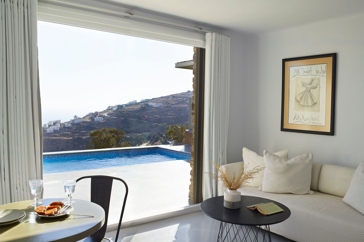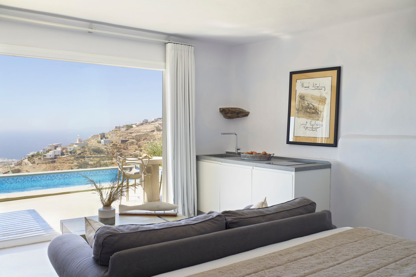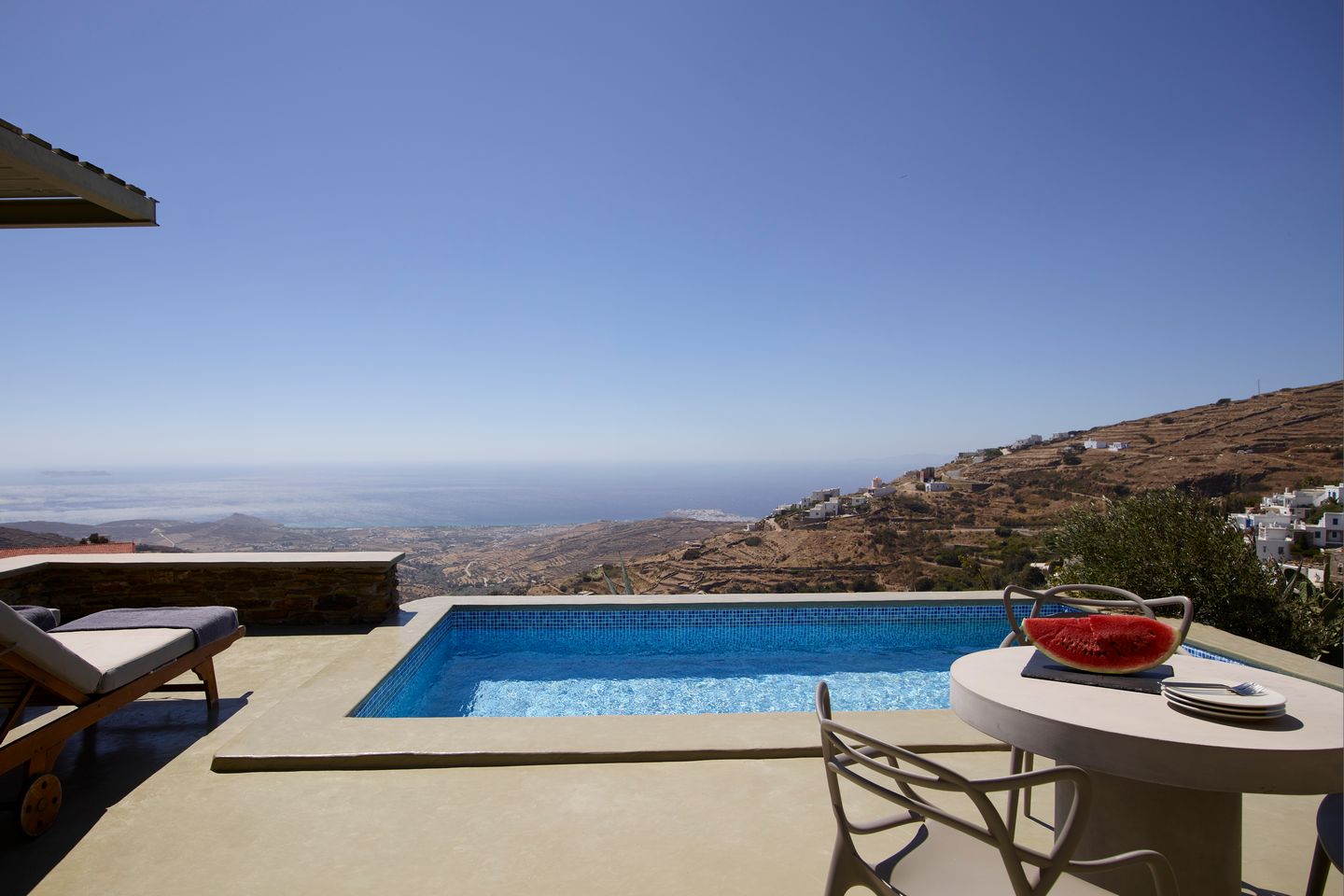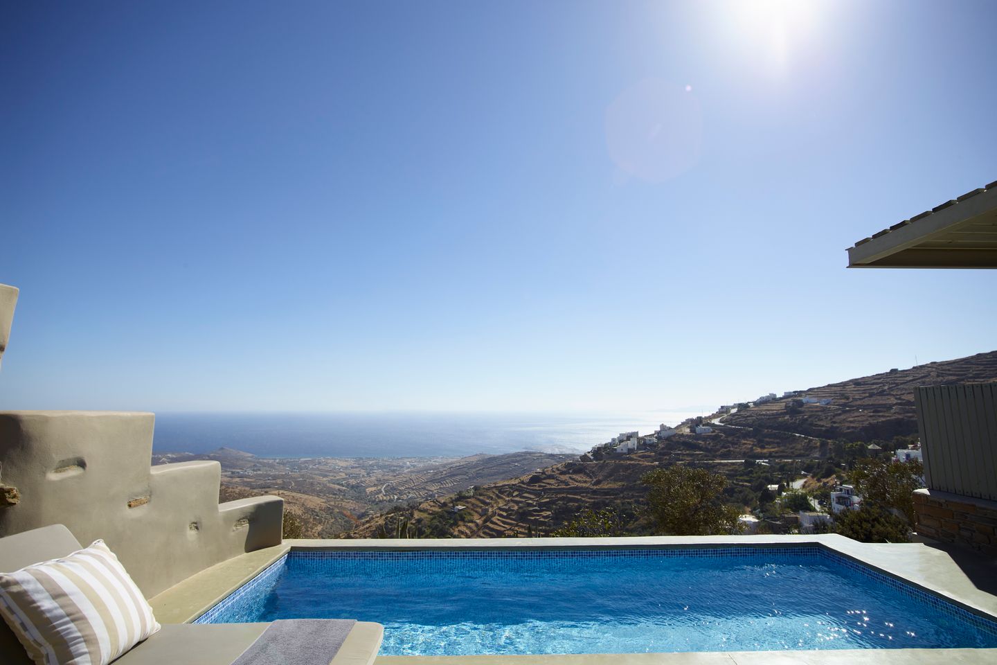 Στον εξωτερικό χώρο, η ιδιωτική πισίνα συμπληρώνει την εμπειρία της διαμονής, με ανοιχτή θέα στο Αιγαίο.