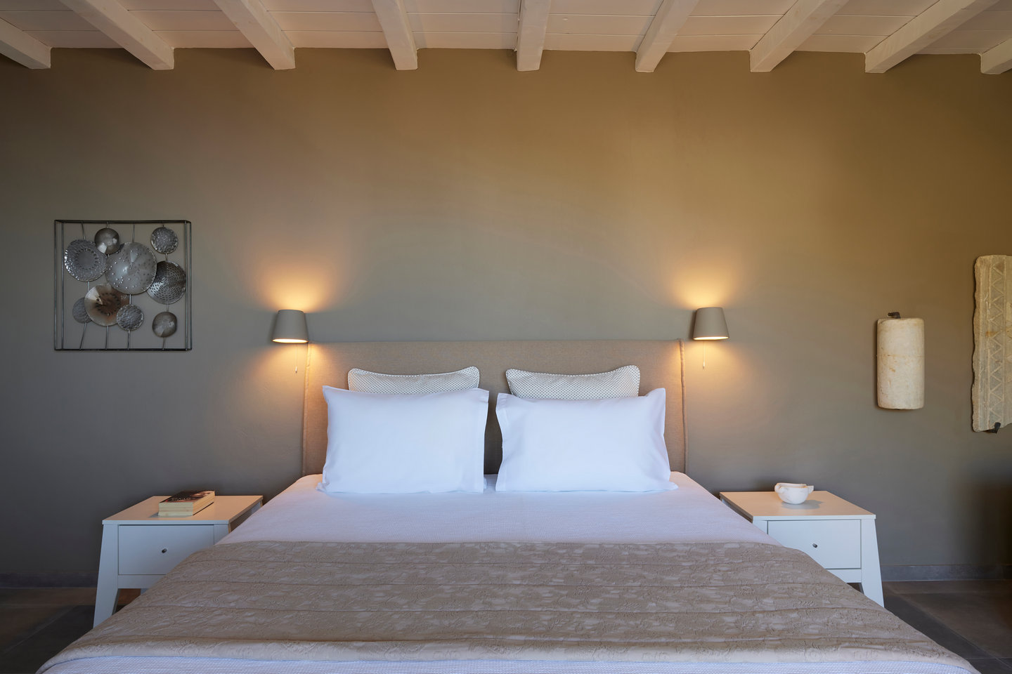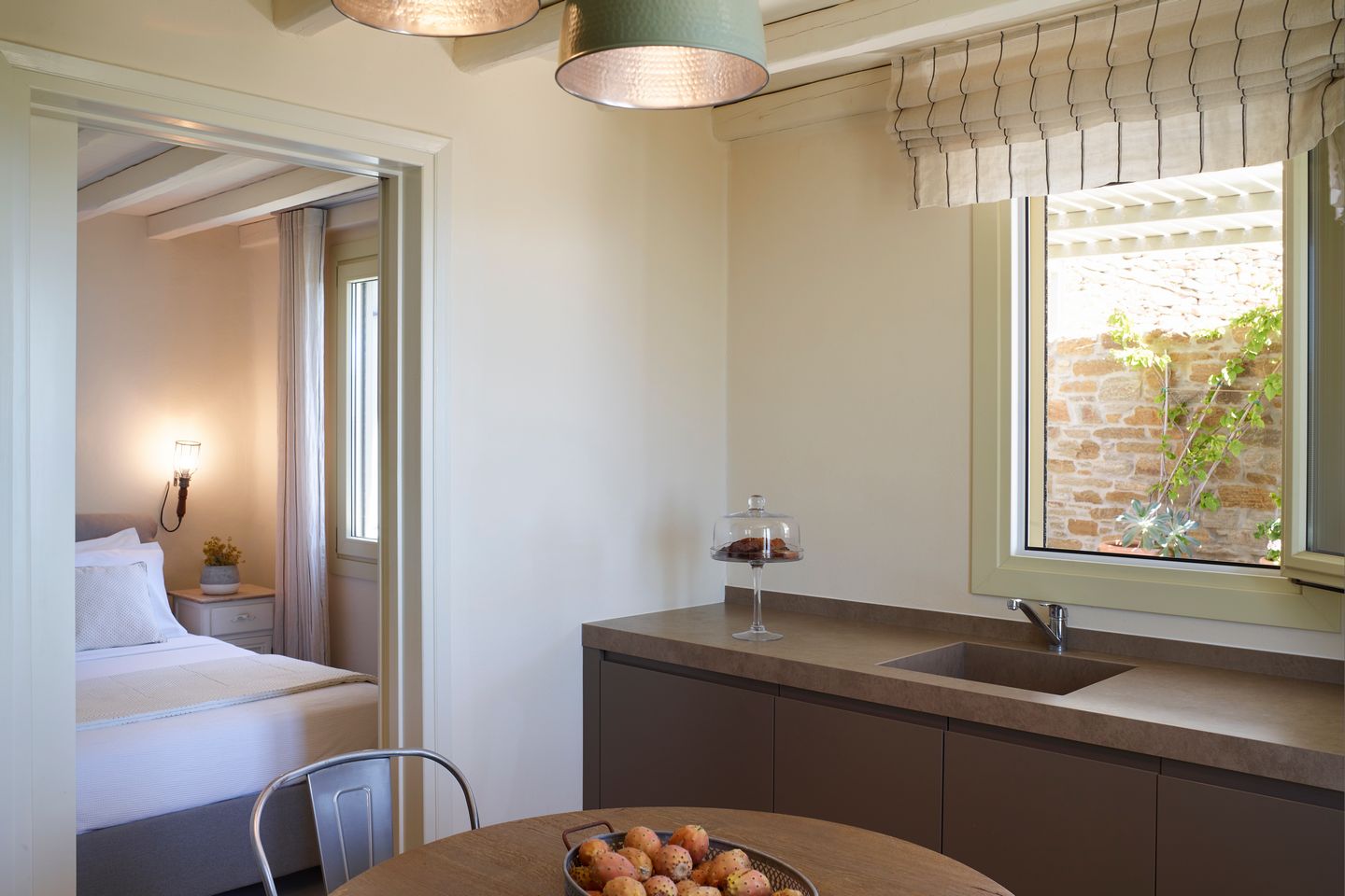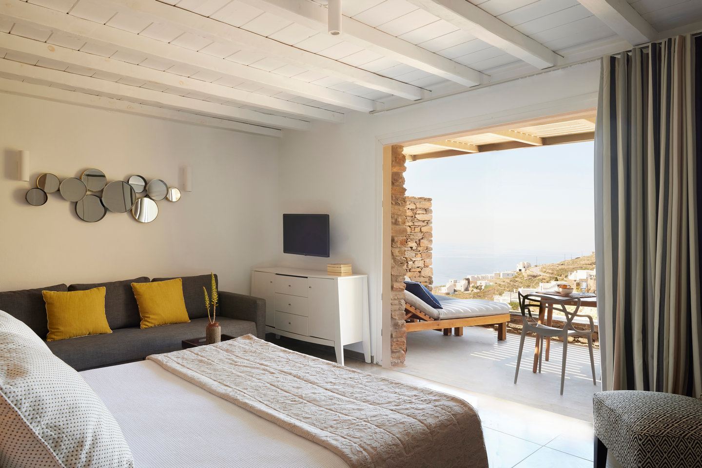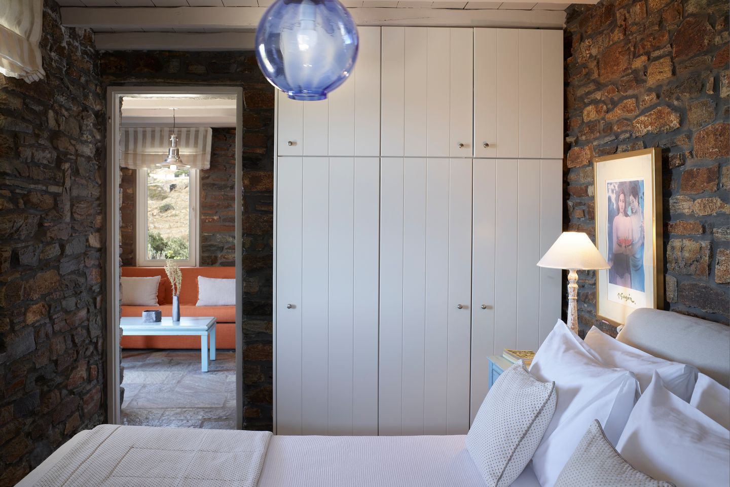 Η σουίτα είναι διχώρη: διαθέτει καθιστικό με καναπέ-κρεβάτι και ξεχωριστό υπνοδωμάτιο με queen-size κρεβάτι. Οι απαλές αποχρώσεις και οι διακριτικές κυκλαδίτικες λεπτομέρειες δημιουργούν μια ήρεμη, κομψή ατμόσφαιρα.