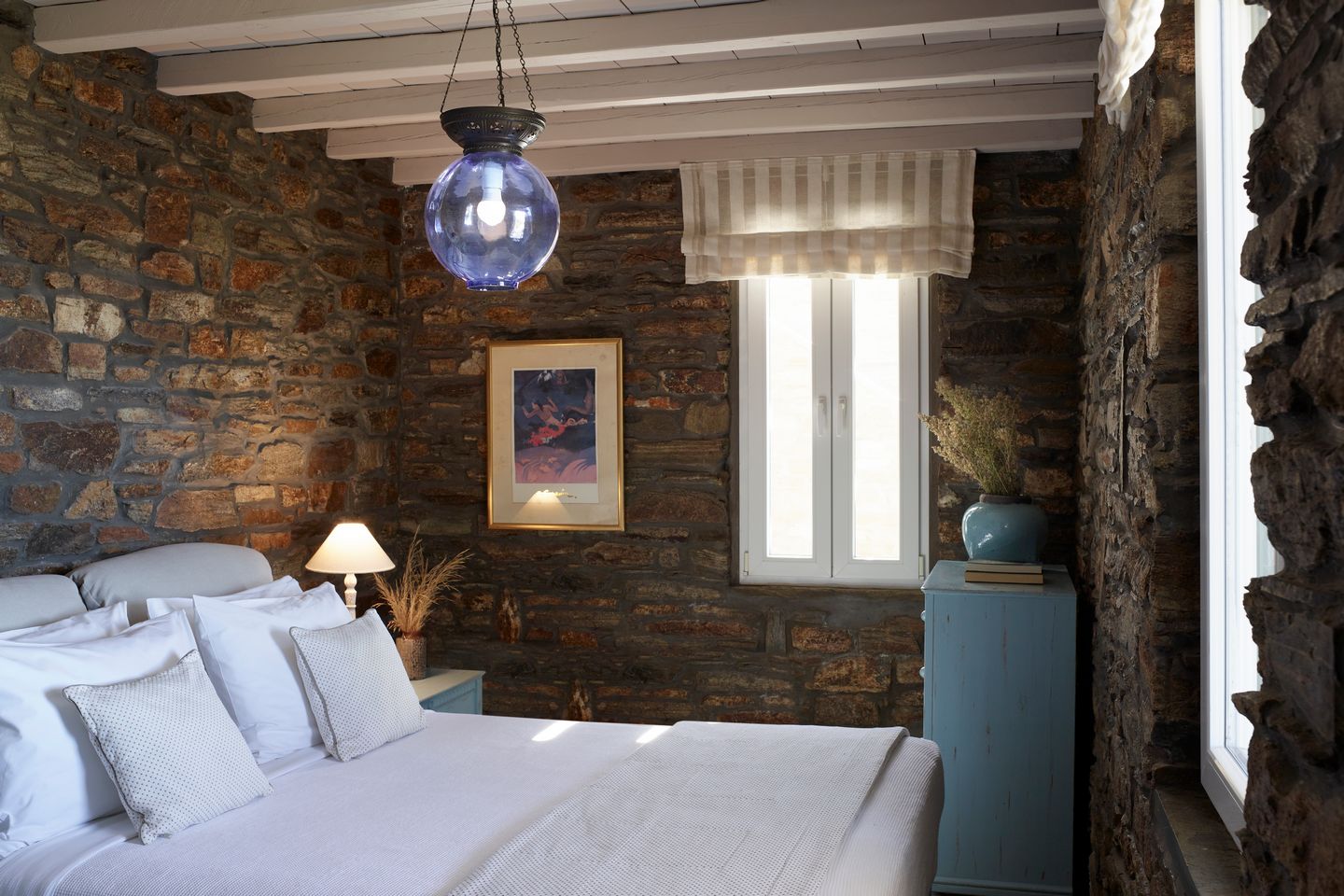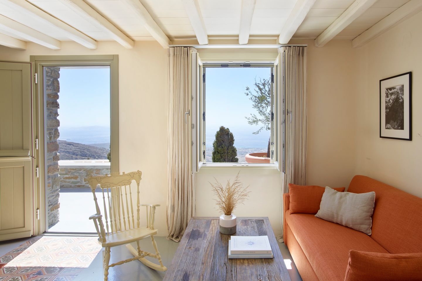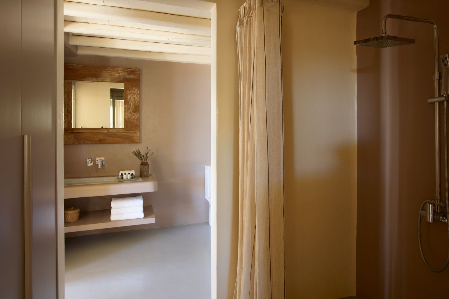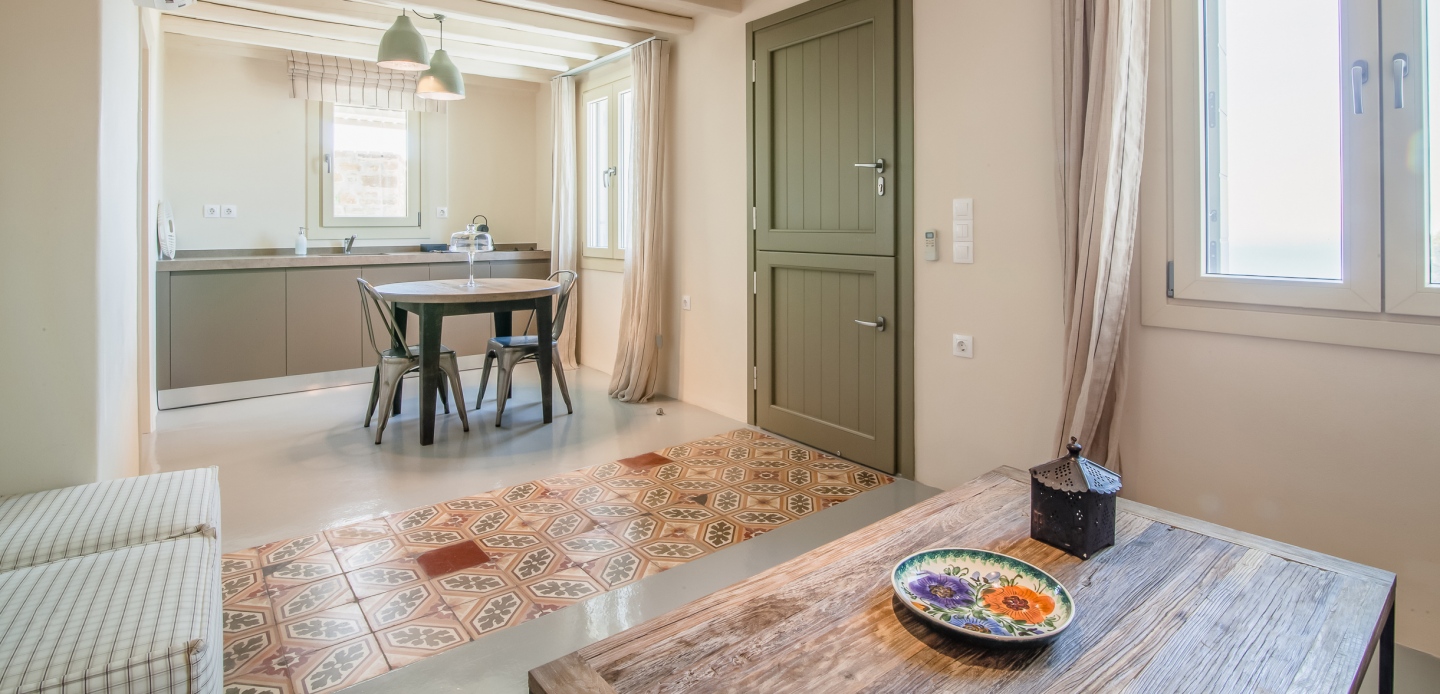 Η σουίτα είναι διχώρη: διαθέτει καθιστικό με καναπέ-κρεβάτι και ξεχωριστό υπνοδωμάτιο με queen-size κρεβάτι. Οι απαλές αποχρώσεις και οι διακριτικές κυκλαδίτικες λεπτομέρειες δημιουργούν μια ήρεμη, κομψή ατμόσφαιρα.