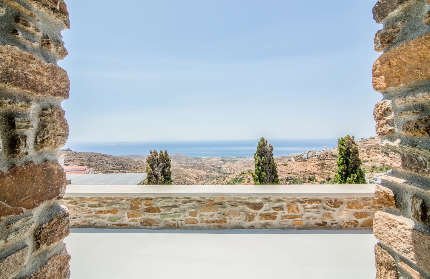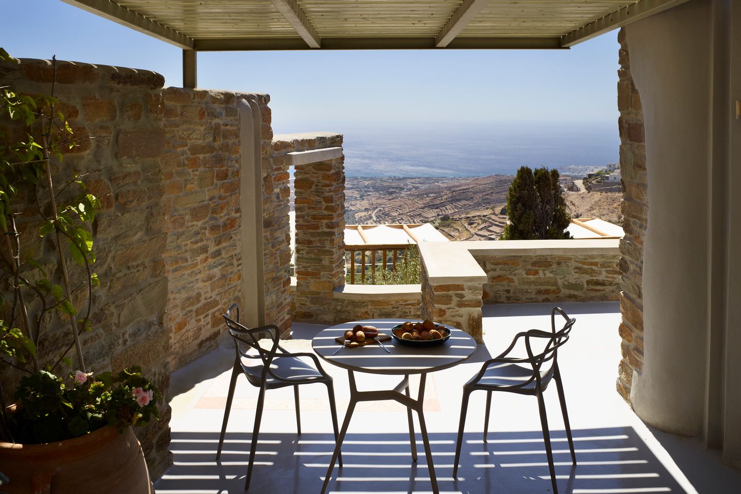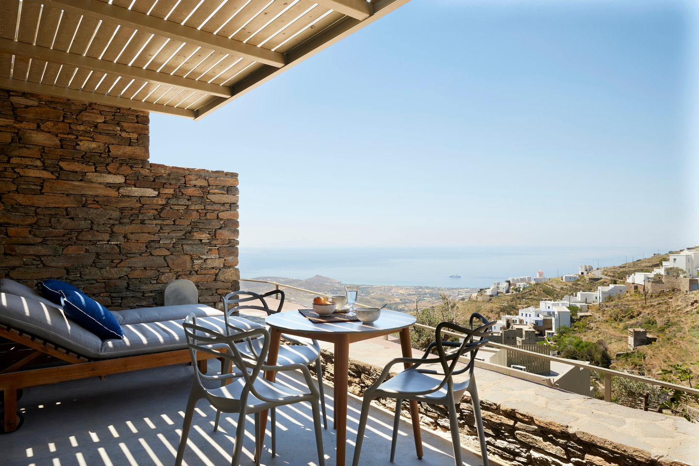Η ιδιωτική βεράντα ολοκληρώνει την εμπειρία της διαμονής, με πανοραμική θέα στο Αιγαίο.